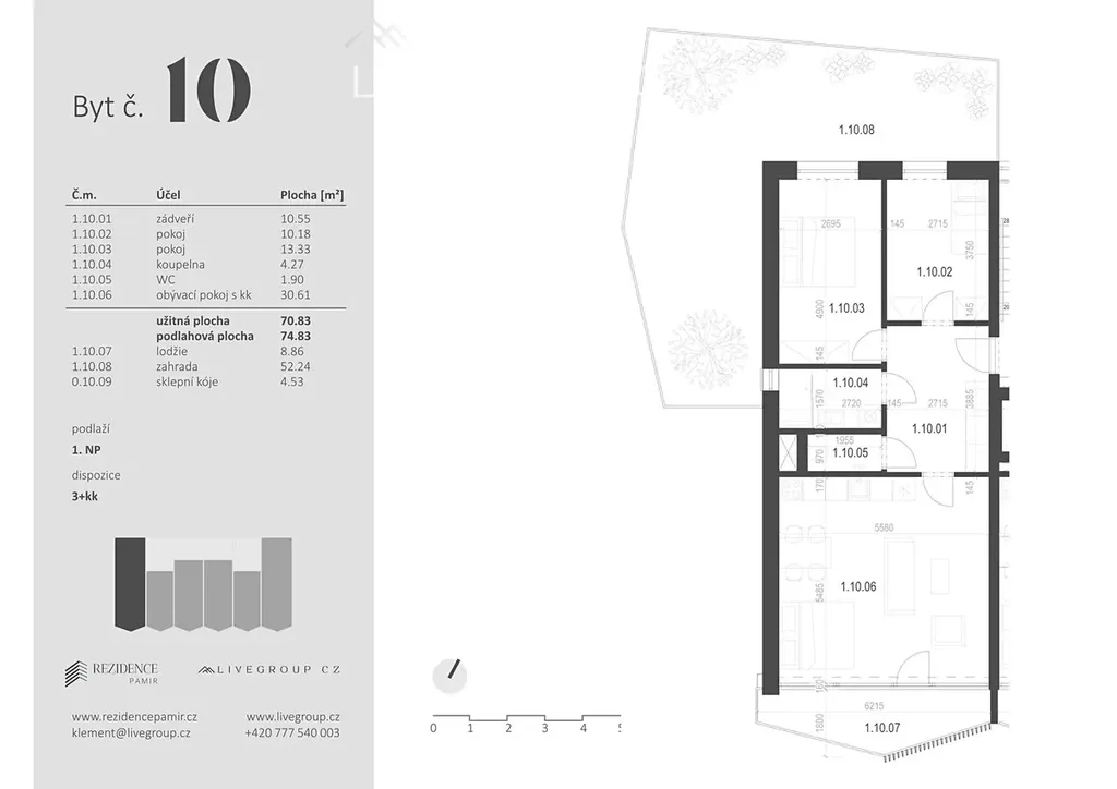 Tento byt č. 10 je umístěn v prvním 4 podlažní budovy. Jedná se o byt 3+kk s výměrou 74,83 m2 směřující na jižní a severní stranu. Obytný prostor prodlužuje zahrádka s terasou o výměře 61,1 m2. K bytu náleží sklepní prostor o výměře 4,53 m2. Ke každému bytu náleží jedno parkovací stání za 350.000 Kč a také je možnost dokoupení prostorné garáže s elektrickými vraty.