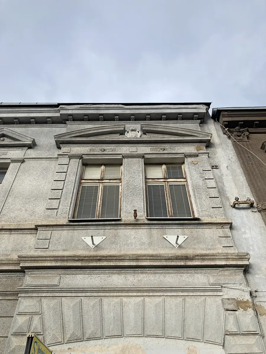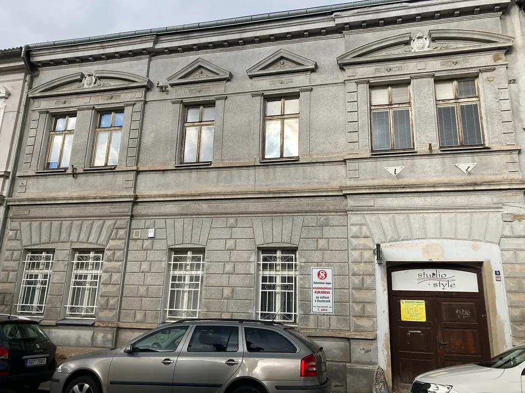 Dům je v dobrém stavu určen k úpravám dle potřeby. Vjezdními vraty se prochází do vstupní haly, kde jsou umístěny měřiče el. a dále je tu vstup do dvou přízemních (se zamřížovanými okny) jednotek: bytová jednotka 1+1 ( 50m2) - prázdná, a nebytová - fungující ordinace veteriny ( 60m2). Po schodech je vstup do kanceláří v 1.patře, možno dispozičně rozdělit na 2 jednotky. Zde je 5 místností s velkými okny - původní špaletové, vytápění - plyn. kotel, kuchyňky, WC v mezipatrech do přízemí a na půdu. Půda vysoká 6m, krov ve velmi dobrém stavu - možnost půdní vestavby, střešní kratina plechová. Dům již neužíván kromě ordinace v přízemí, nabízí se možnost předělání na bytové jednotky popř. půdní byty. Prodej formou dražby dne 23.2.na portále Drazby-Prost.