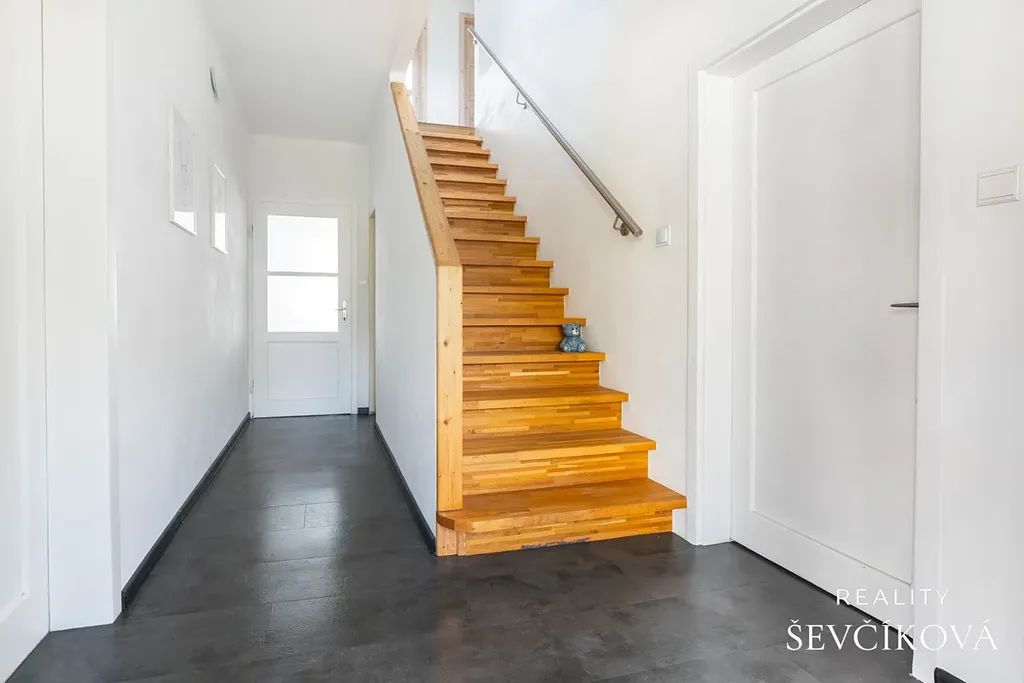 přízemí (90 m² + zádveří 6 m²): velmi prostorná vstupní hala se schodištěm a vstupem do sklepa (26 m²), samostatné WC, velká šatna s navazující koupelnou a dalším WC, komora s pračkou, ložnice, velkorysý obývací pokoj s jídelnou, kuchyň se spižírnou