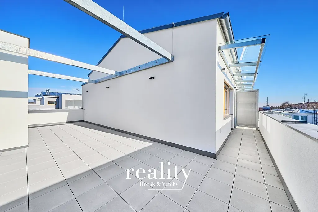 Balkon a terasa: Balkon o ploše 5 m² doplňuje velkolepá terasa (34 m²), ideální pro relaxaci, grilování nebo pěstování zeleně.