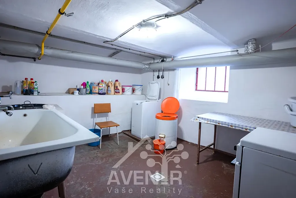 1.PP - garáž (28,8 m²), sklípek (8 m²), prádelna (10,5 m²), sušárna (12 m²), kotelna (20 m²), chodba (6 m²) a schodiště (7 m²).
