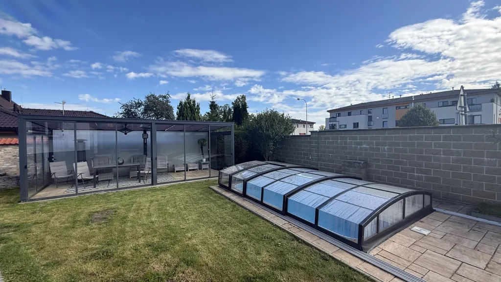 Na udržované zahradě se nachází krytý bazén a bioklimatická pergola s posezením. Součástí pozemku je také samostatná vedlejší stavba s kuchyňskou linkou a sprchovým koutem, kterou lze využít jako samostatnou bytovou jednotku, zázemí pro hosty nebo jako plnohodnotné zázemí k bazénu a venkovnímu posezení.