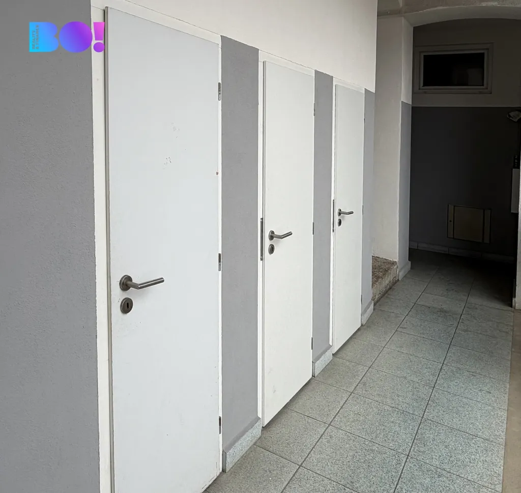 Okna bytu jsou orientována na západ a do klidného vnitrobloku, což zajišťuje dostatek přirozeného světla a nerušené bydlení bez hluku z přilehlé ulice.