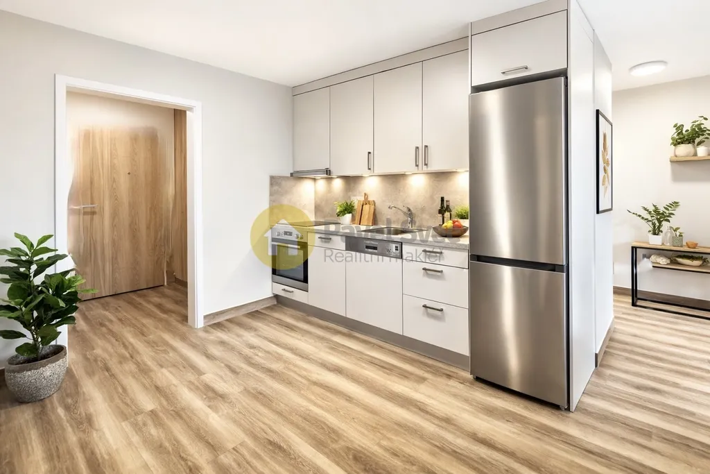 Prostorný byt (v chodbě a předsíni ideálně vestavné skříně) s praktickým řešením dispozice - do ložnice vstup z chodby bytu a do většího pokoje (obývací) jsou dokonce vstupy dva - z chodby a z kuchyně.