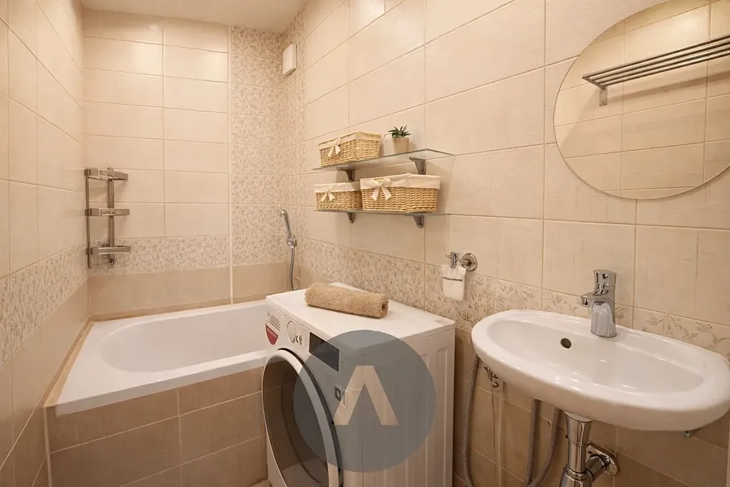 Kuchyně disponuje indukční varnou deskou, troubou, mikrovlnnou troubou, vestavěnou lednicí i varnou konvicí. Koupelna s vanou a pračkou se sušicí funkcí je oddělena od samostatné toalety.
