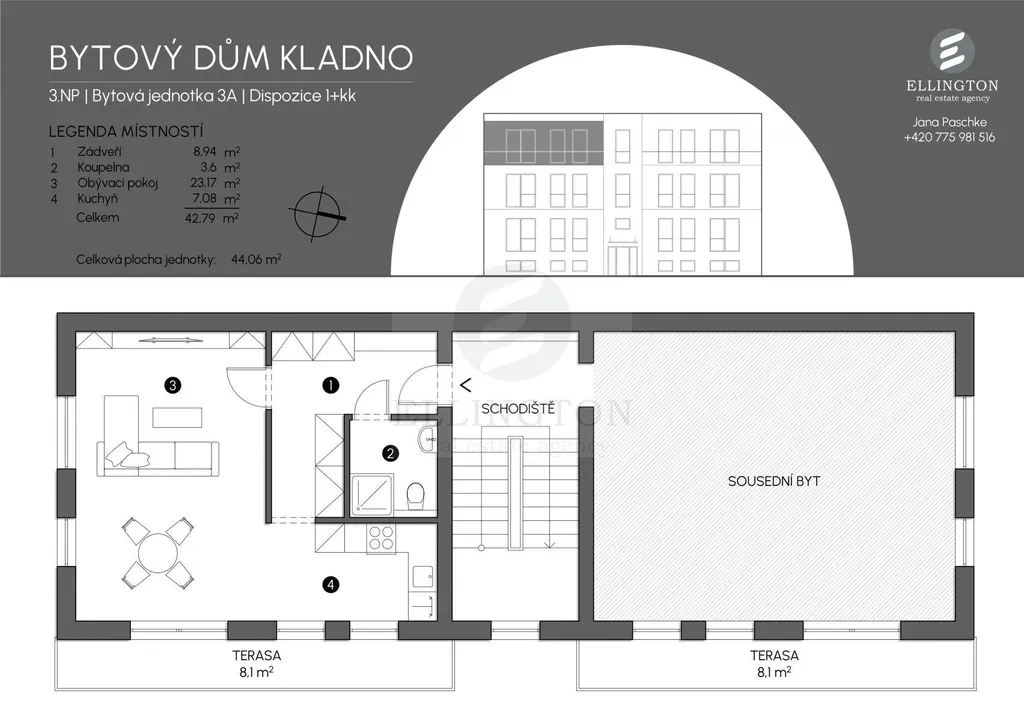 Tímto bychom vám chtěli nabídnout byt 2+kk o celkové rozloze 44m2 + 8,1m 2 terasa, který je součástí 6-ti bytů v rezidenčním projektu U zámku v Zádušní ul. Kladno, který se nachází přímo v centru Kladna, v klidné části mimo hlavní silnici.