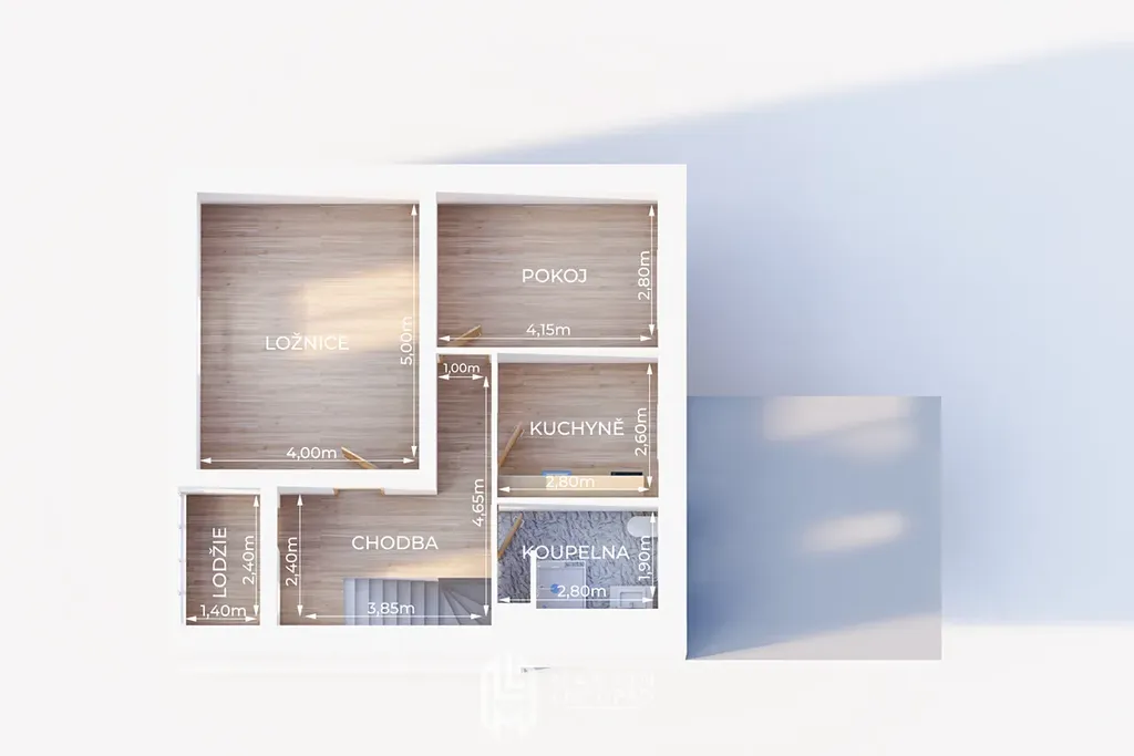 vstupem na lodžii, koupelna s WC, kuchyně a dva další neprůchozí pokoje.