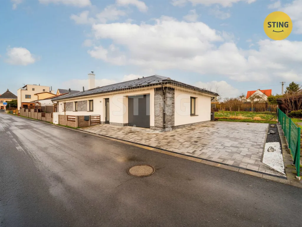 Dispozice domu : vstupní chodba, tři samostatné ložnice, koupelna, technická místnost a prostorný obývací pokoj s kuchyní. Z obývací části je přímý vstup na krytou terasu a navazující zahradu – ideální pro relax i rodinná setkání. Vytápění zajišťuje úsporný kondenzační kotel napojen na podlahové topení, v obývacím pokoji je navíc krb pro příjemnou atmosféru a doplňkový zdroj tepla.
