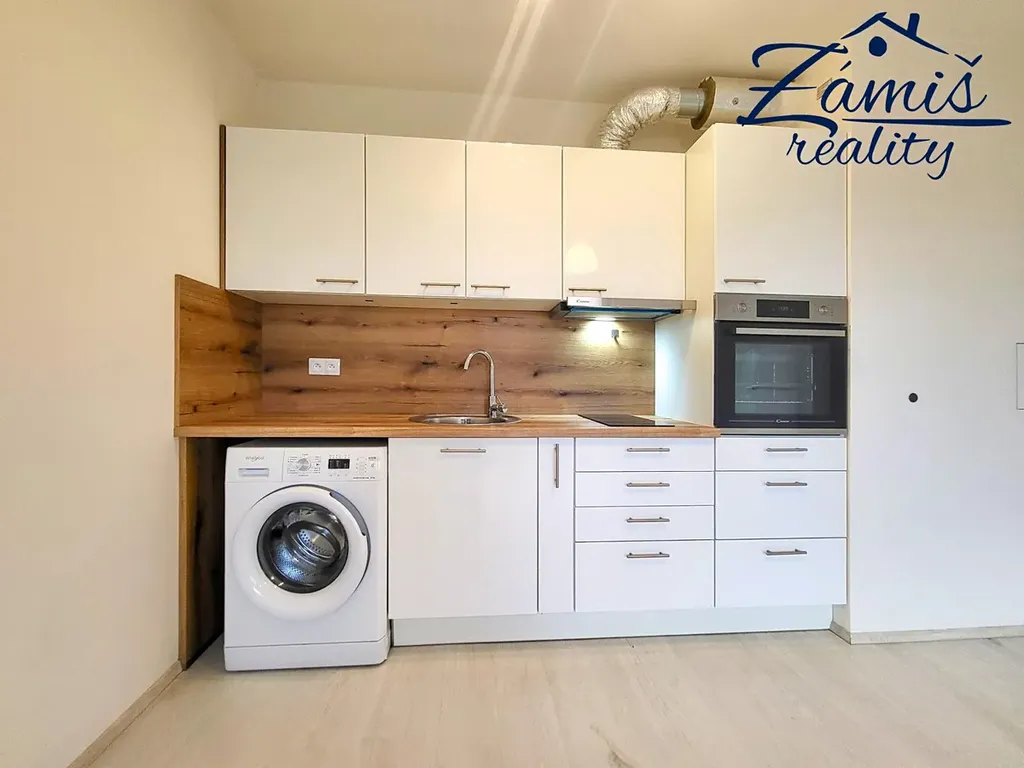 Byt je vybaven kuchyňskou linkou s el. varnou deskou s digestoří, el. troubou, lednicí a pračkou.