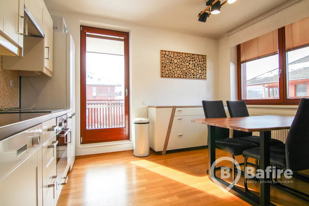 Kuchyňská linka je vybavena všemi nezbytnými spotřebiči - myčka, elektrická trouba, varná deska včetně digestoře, lednice s mrazákem. V koupelně se poté nachází novější pračka značky AEG. Veškerý nábytek, kterým je byt zařízen, je ve velmi dobrém stavu. Postačí si zabalit pouze své osobní věci a odstartovat novou životní etapu právě tady.