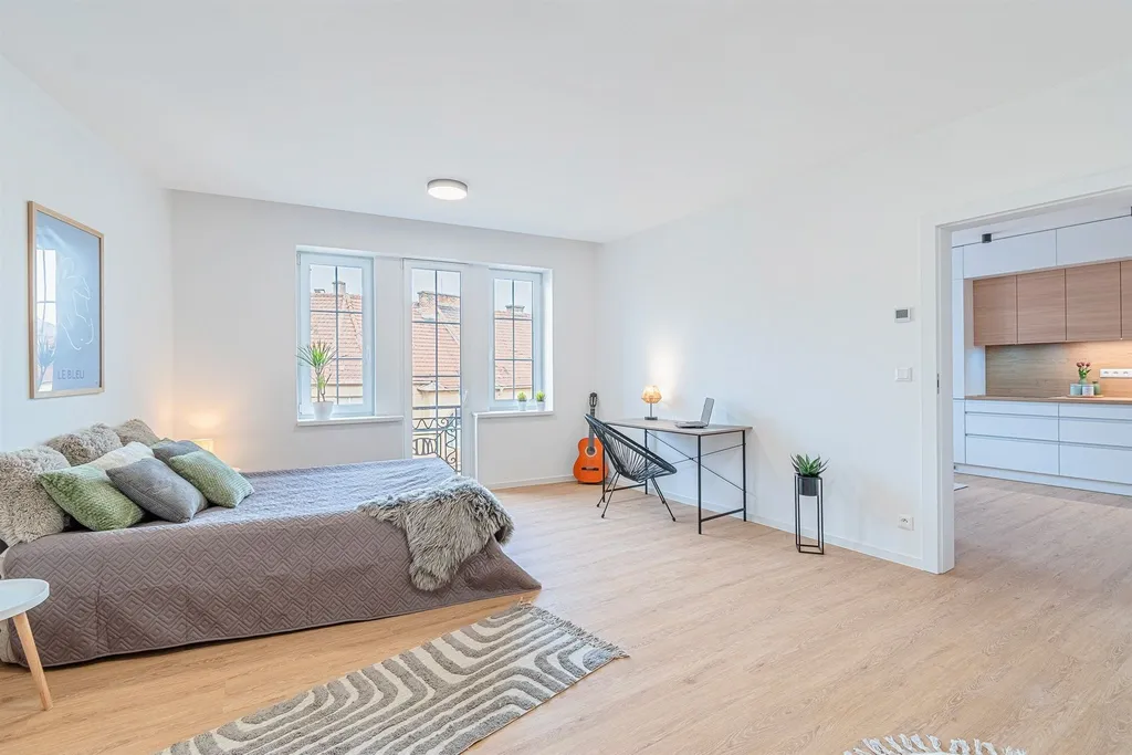 Krásný, nově rekonstruovaný byt s dispozicí 3+kk, který se nachází ve 3. patře cihlového bytového domu stojícího v širším centru města Prostějova.