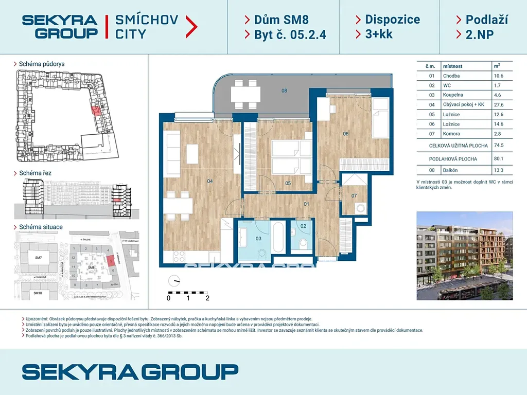 Dovolujeme si Vám nabídnout k prodeji byt 3+kk o výměře 80,1 m² s balkónem 13,3 m² v rezidenčním projektu Smíchov City, blok SM8.