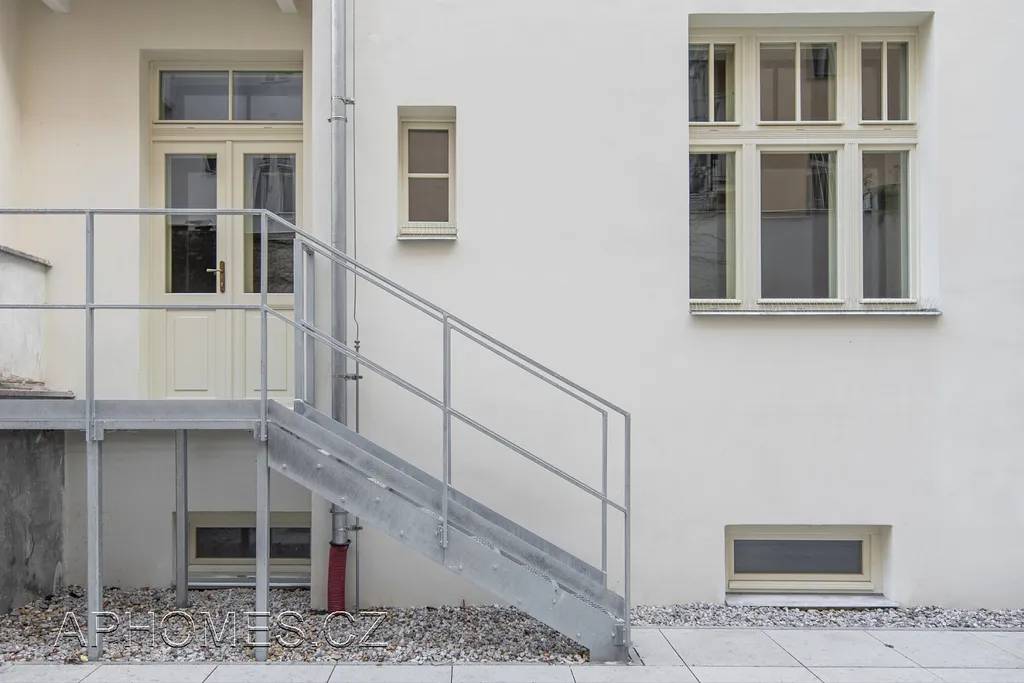 Dva kancelářské prostory s plochou (39.12m²) a (38.17m²) směrem do vnitrobloku mají samostatný vstup ze společné chodby domu, každý samostatně má trojkřídlé špaletové okno a špaletové balkonové dveře se v stupem na dvůr. Přípravu pro kuchyň, koupelnu a oddělenou toaletu. Tyto prostory mohou být spojeny s prostory do ulice.