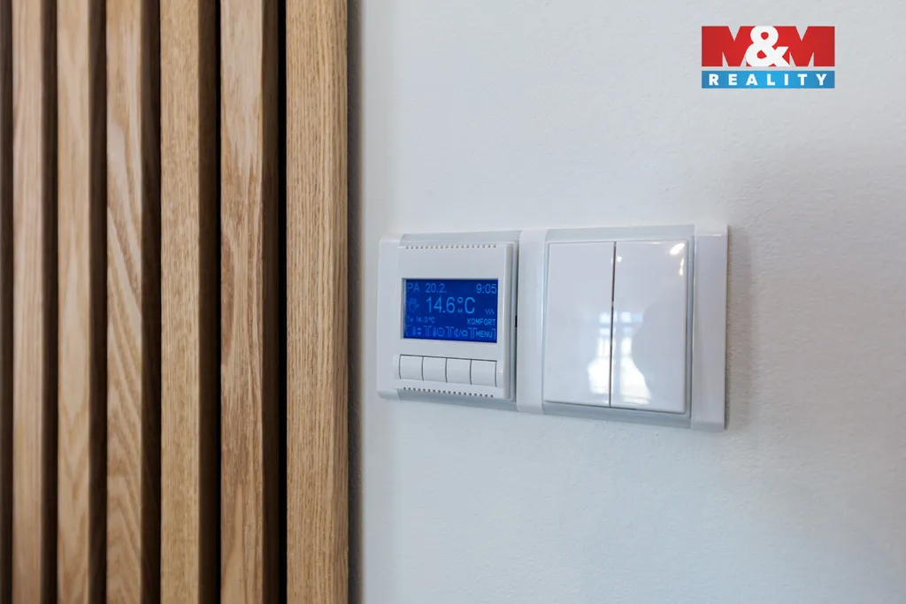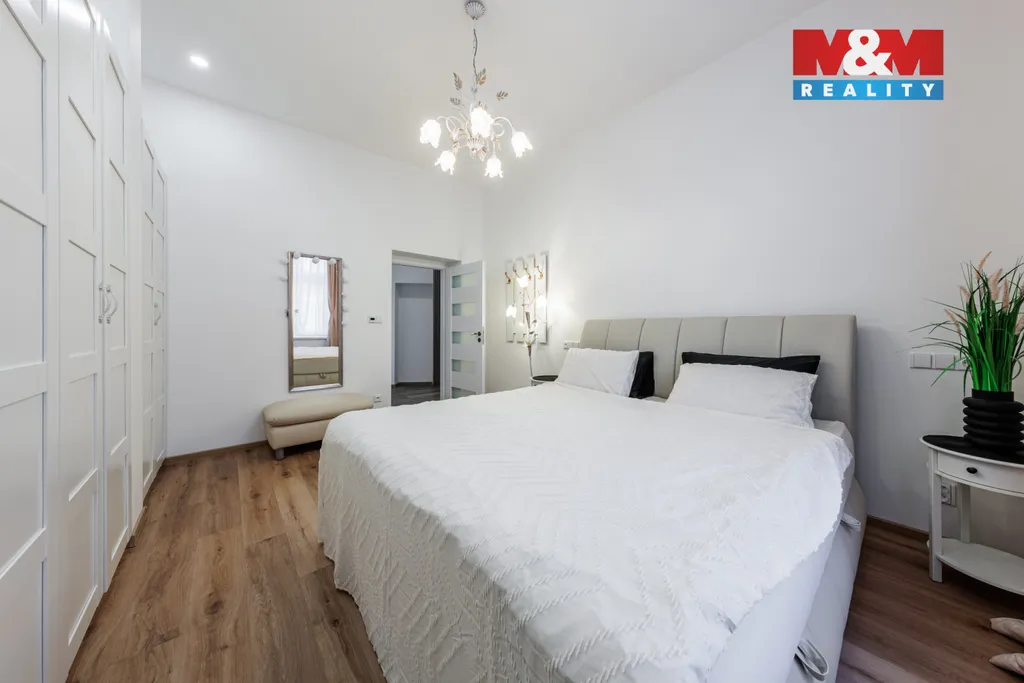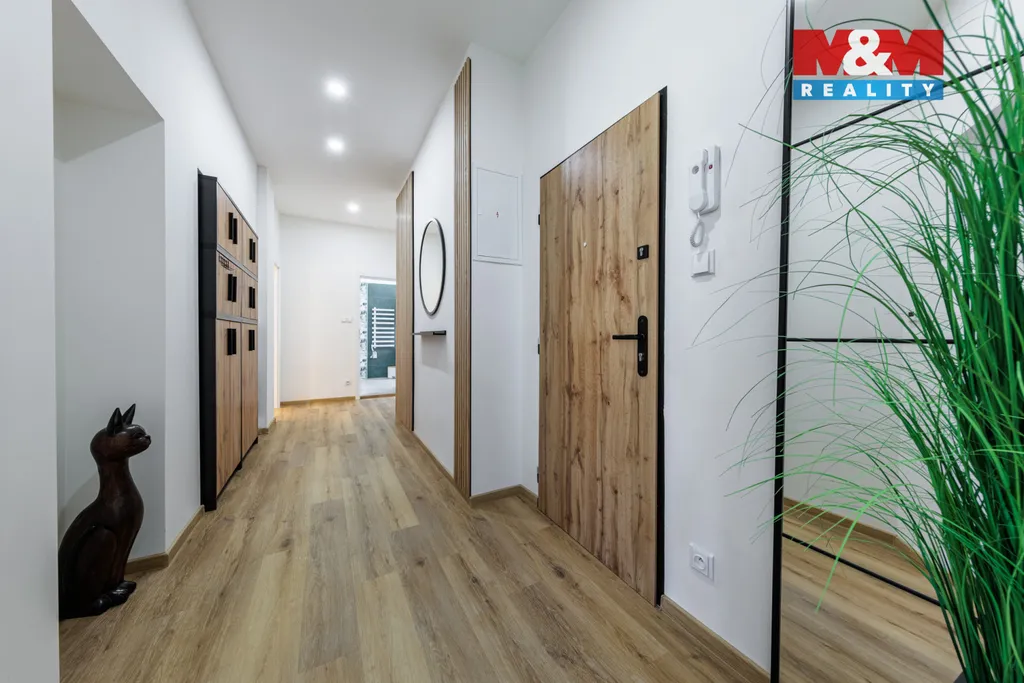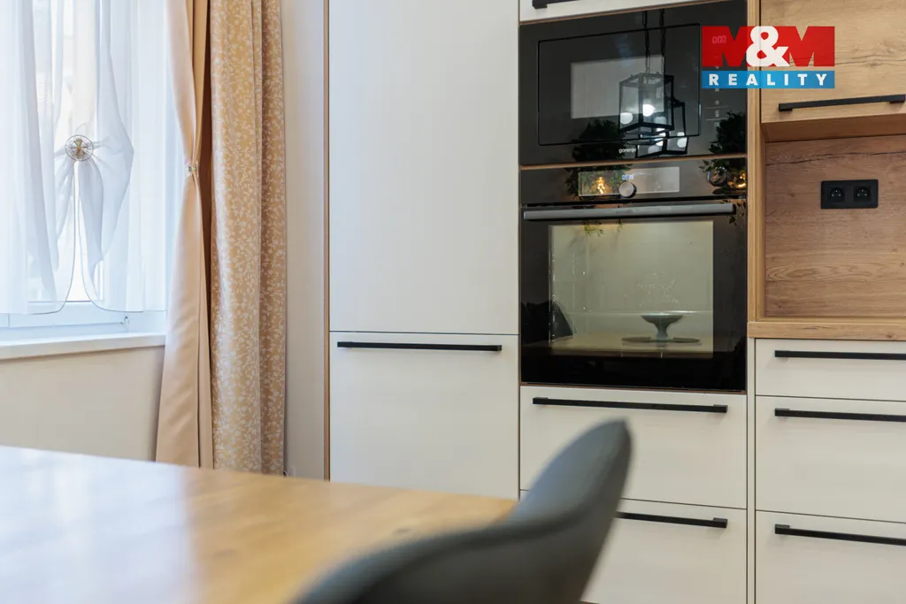 Dispozici tvoří prostorná předsíň, rohový obývací pokoj s okny na sever a západ a francouzským oknem na jediný balkon v domě, moderní kuchyně s vestavnými spotřebiči (myčka, pračka, sušička, varná deska, trouba, mikrovlnná trouba, digestoř), ložnice s velkými vestavnými skříněmi, nadstandardní koupelna se sprchovým koutem, WC a bidetem a technická místnost s boilerem. V celém bytě je elektrické podlahové vytápění a použity kvalitní materiály. Součástí ceny je kuchyňská linka se spotřebiči, ostatní nové vybavení lze odkoupit za 150.000 Kč.
