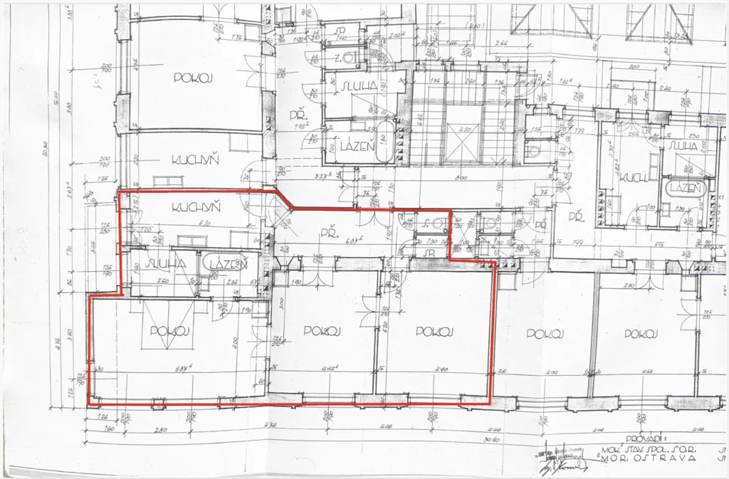 Dispozičně byt nabízí tři prostorné pokoje, z nichž jeden je průchozí a tvoří přirozené centrum bytu. Dále je k dispozici samostatná kuchyň, ze které je vstup na balkon. Z kuchyně je zároveň přístup do menší místnosti, která v minulosti sloužila jako pokoj pro služku a dnes může být využita například jako pracovna, šatna či úložný prostor. Vedle toalety se nachází také praktická spíž.