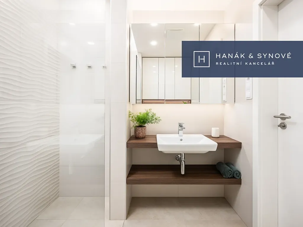 Byt je zařízený ve vysokém standardu a je nabízen plně zařízený – kuchyňská linka se spotřebiči (varná deska, mikrovlnná trouba, vestavěná lednice s mrazákem, pračka se sušičkou), vestavěná skříň, postel, židle, venkovní žaluzie. Koupelna je vybavena walk-in sprchovým koutem se skleněnou zástěnou značky HÜPPE, záchodem a umyvadlem s umyvadlovou skříňkou, podsvíceným zrcadlem.