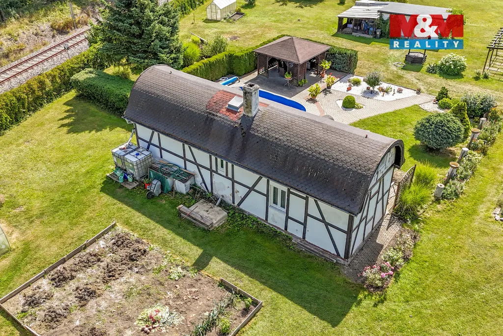 Nabízíme Vám jedinečné místo v lázeňském městě Františkovy Lázně, které se nachází v blízkosti lázeňských parků, ideální pro milovníky klidu a přírody. Na rovinatém pozemku o výměře 4009 m² stojí hrázděný objekt s obloukovou střechou s obytným podkrovím o velikosti 55 m², celková zastavěná plocha a nádvoří je dle KN 369 m². Fasáda je původní, okna jsou plastová, v podkroví jsou nové trámy a izolace. Dům je soběstačný s elektřinou ze solárních panelů + gelových baterií, užitková voda je z vlastní kopané studny. Před domem je zabudovaný bazén a dřevěná pergola pro posezení s rodinou. Aktuálně je využíváno jen k rekreačním účelům, pro celoroční bydlení jsou nutné úpravy. Vytápění zajišťují kamna na tuhá paliva. Velký potenciál nabízí udržovaná zahrada, kde se dále nachází dvě zděné kůlny, pergola pro auta, skleník, záhony, ovocné stromy. Přístup k nemovitosti je zajištěn veřejnou cestou. Pokud Vás tato nabídka zaujala, neváhejte mě kontaktovat pro více informací a sjednání prohlídky.