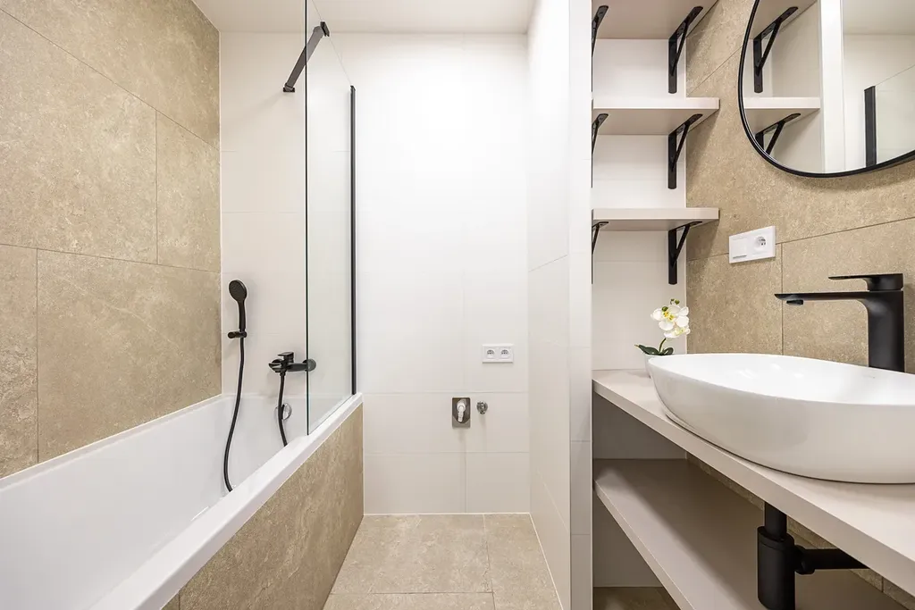 - nová sanita (vana, sprchový kout, umyvadlo, skříňka, toaleta)