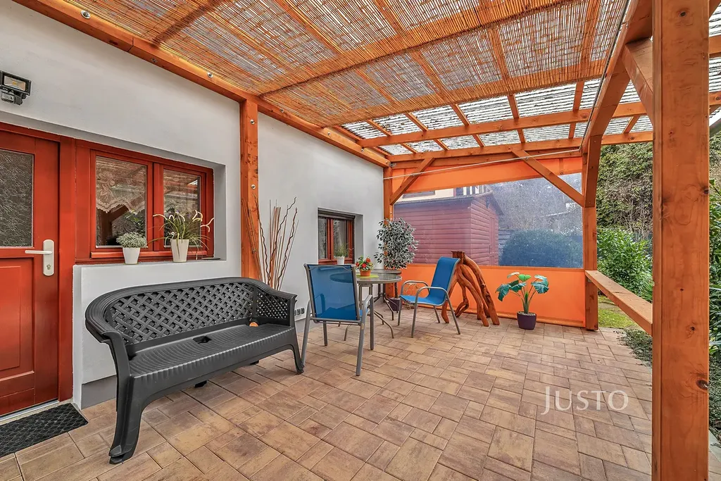 K domu náleží terasa o velikosti 22 m², která poskytuje příjemné místo k odpočinku s výhledem do udržované zahrady o rozloze 352 m². Pozemek je oplocený a nabízí dostatek soukromí. Parkování je zajištěno na vlastním pozemku. Další parkovací stání je před domem. Dům je napojen na všechny inženýrské sítě (vodovod, plynovod, veřejná kanalizace, elektřina – 3 fáze), vytápění zajišťuje tepelné čerpadlo a krbová kamna, ohřev vody je řešen tepelným čerpadlem a elektrickým bojlerem. Energetická náročnost budovy je ve třídě C – úsporná (94 kWh/m²/rok), což znamená velmi nízké provozní náklady.