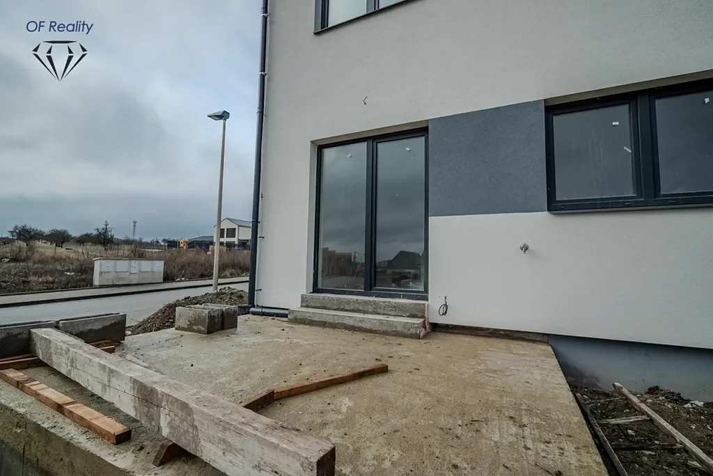 Dům je ve fázi hotová fasáda, osazená okna, podlahy