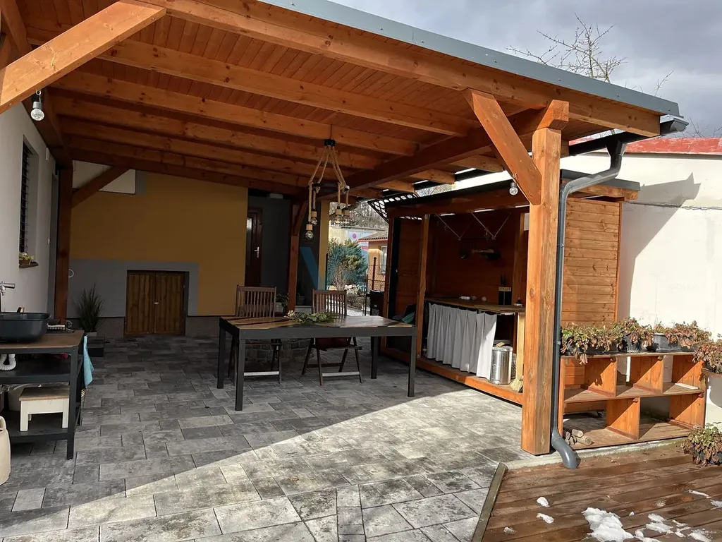 Nachází se zde kuchyňský kout, obývák s ložnicí, sklopně posuvné dveře a vchod na zahradu.
