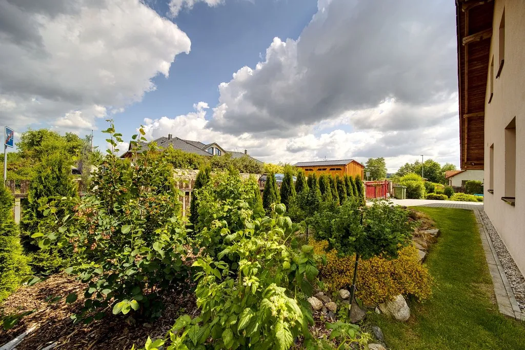Na zahradě (1166m²) se nachází altánek, venkovní sprcha a přístřešek pro 2 auta s kůlnou s půdním prostorem.