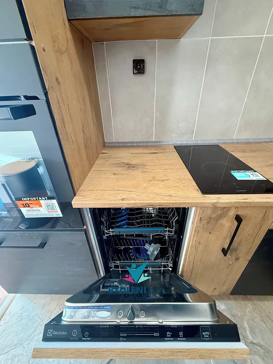 Dominantou bytu je nová nadstandardní kuchyňská linka, vyrobená z kvalitních materiálů a vybavená moderními spotřebiči: