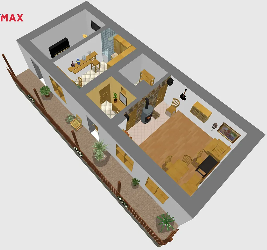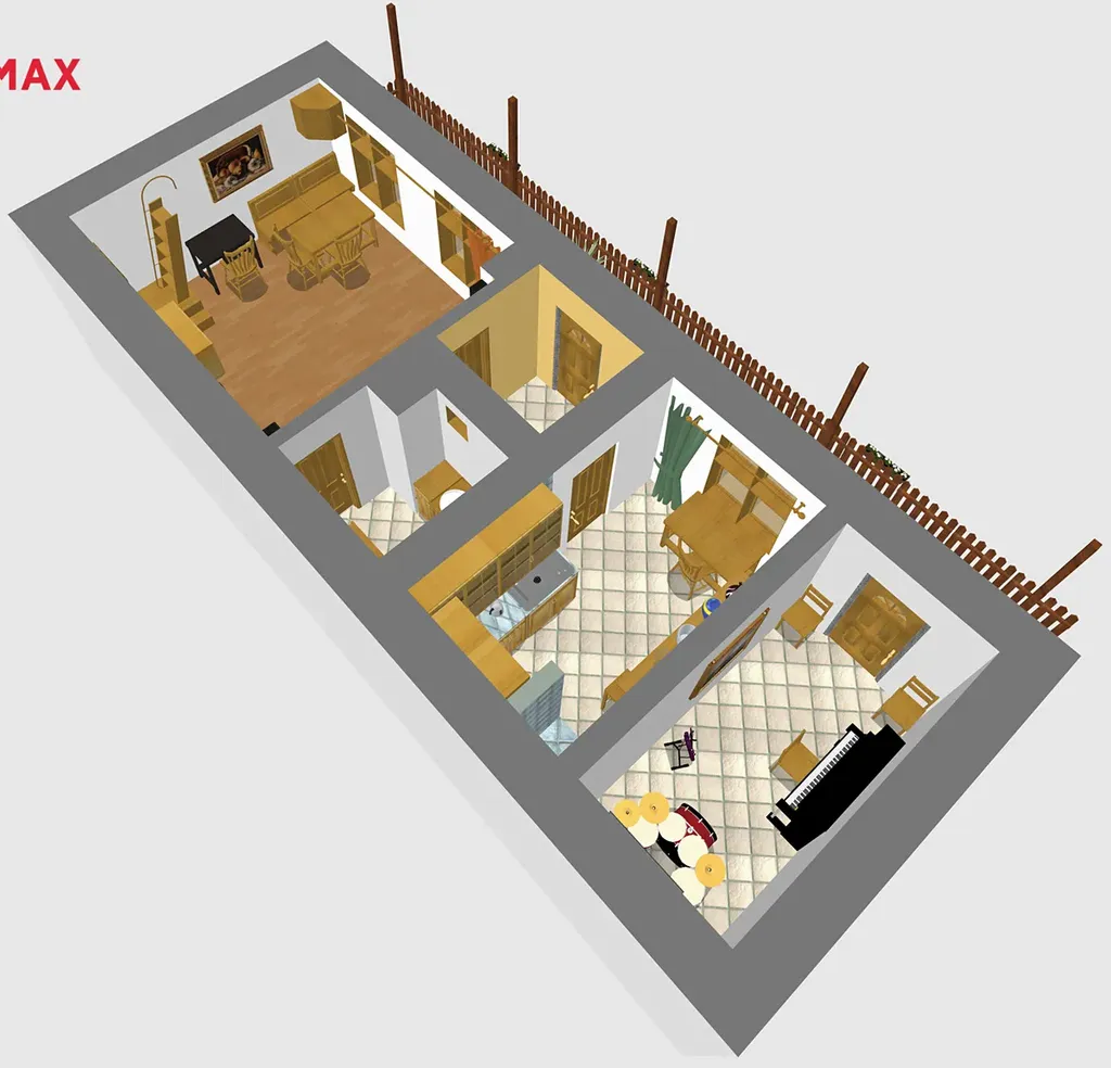 V přízemí domu se nachází předsíň, kuchyně, obývací pokoj a koupelna, dále pak samostatná místnost místnost s vchodem přímo ze zápraží (lze upravit jako další pokoj s vchodem z kuchyně). V prvním patře domu se nachází pokoj s balkonem a půda, kde je možnost vybudovat půdní vestavbu. Do patra vedou příkré tzv. mlynářské schody.
