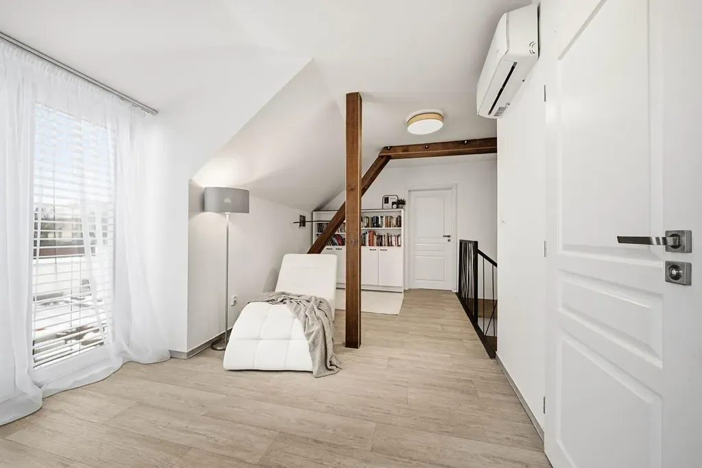 Druhé podlaží je přístupné po samonosném schodišti ze vstupní chodby a nabízí: