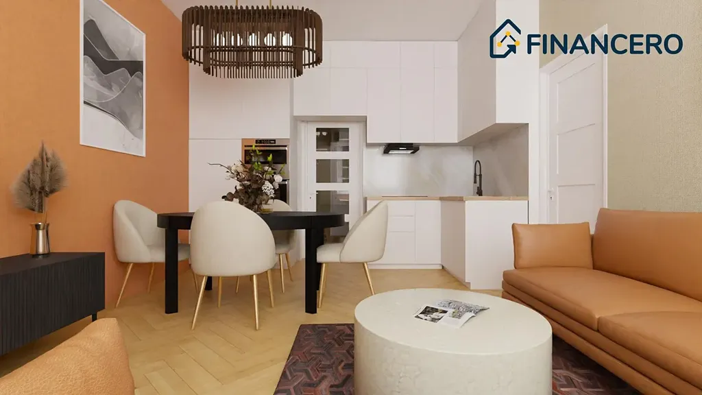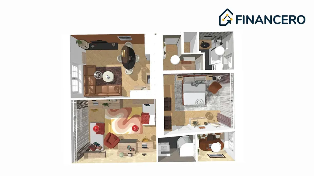 Aktuální dispozice bytu nabízí dva velmi prostorné pokoje o výměrách 19,8 a 20 m2, kde v levém pokoji je poměrně snadné vybudovat kuchyňskou linku a současnou kuchyni tak přetvořit na ložnici orientovanou do vnitrobloku. K ložnici by pak náležela pracovna či šatna o výměře 3,9 m2.