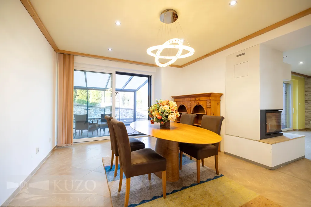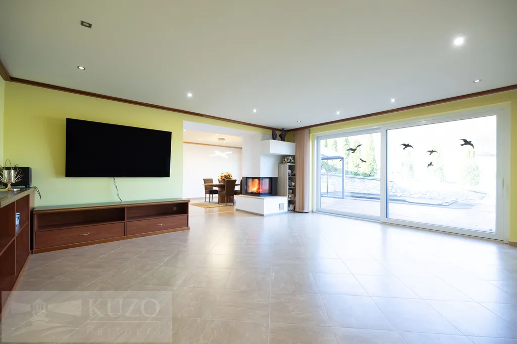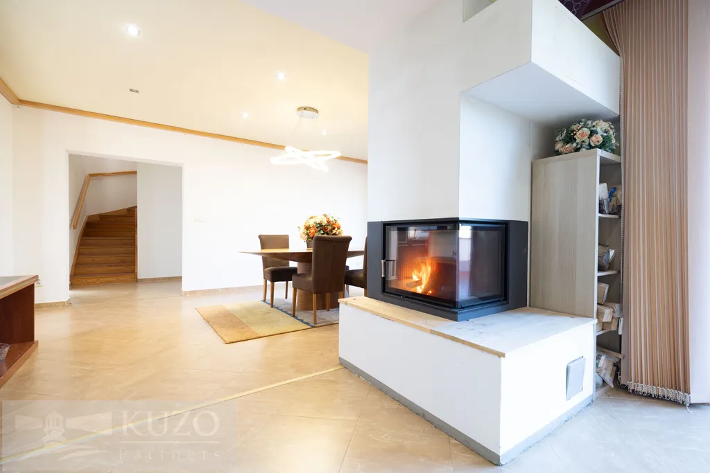 Vytápění zajišťuje elektrický kotel s podlahovým topením, doplněný krbem na dřevo, el. krbovými kamny.