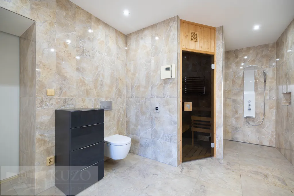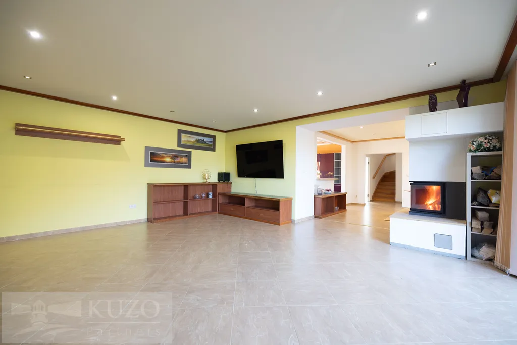 V přízemí (126,17m2) se nachází vstupní chodba s šatní skříní a botníkem, prostorný obývací pokoj s krbem, jídelna s kuchyňským koutem s vestavěnými el.spotřebiči, samostatné WC, prostorná šatna s úložným prostorem pod schodištěm, ložnice s šatnou, koupelna se sprchovým koutem, WC, 2xumyvadlo, sauna, technická místnost.