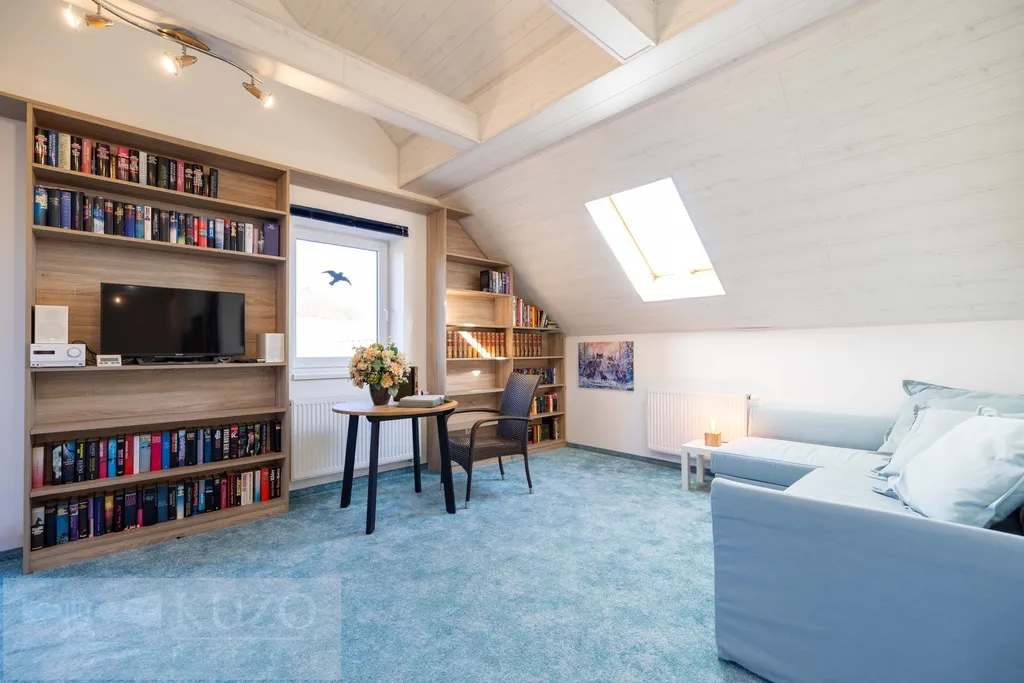 V podkroví ze tří ložnic vznikl jeden členitý otevřený pobytový prostor (57,42m2) se vstupem na terasu 18,04m2, koupelna a WC, lze uvést do původního stavu.