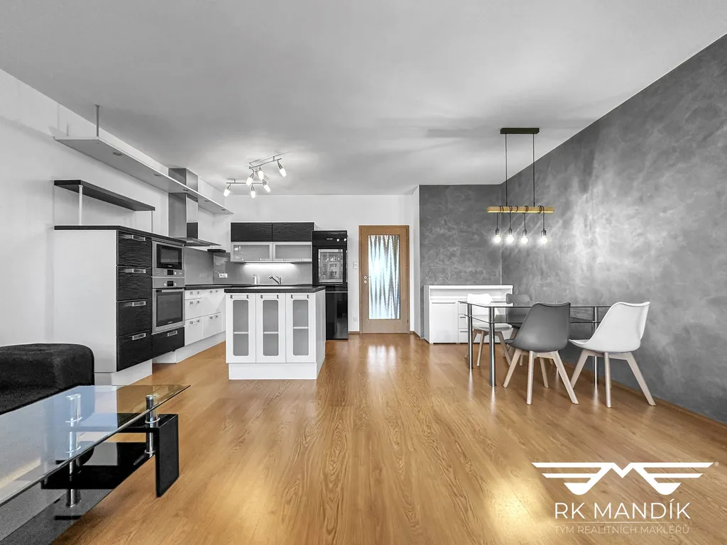 ​Obývací pokoj spolu s kuchyňským koutem (33,87 m²), jehož součástí jsou vestavěné spotřebiče (mikrovlnná a elektrická trouba zn. Bosch, indukční varná deska zn. Baumatix, digestoř, myčka nádobí zn. Ariston a kombinovaná lednice s mrazákem zn. Snaige), je dále doplněn středovým pracovním ostrůvkem. Z kuchyně a obývacího pokoje je vstup na příjemný balkon (7,71 m²). Obývací pokoj je vybaven sedací soupravou s konferenčním stolkem, TV stěnou s držákem na televizi, jídelním stolem s židlemi a komodou. Nechybí praktické fólie na oknech.