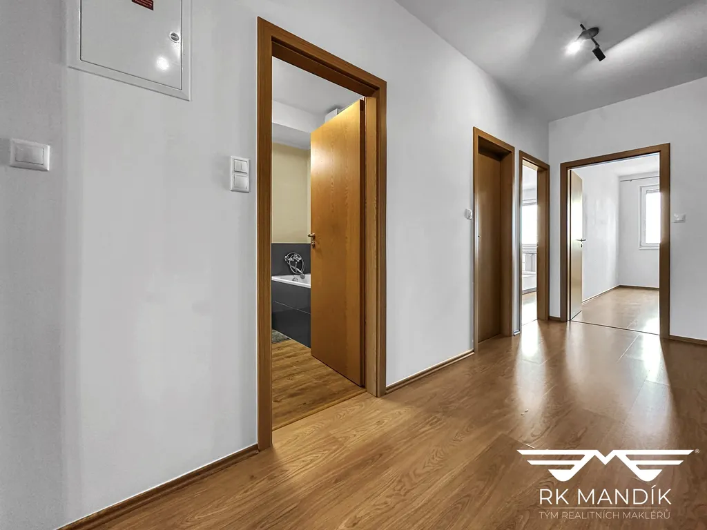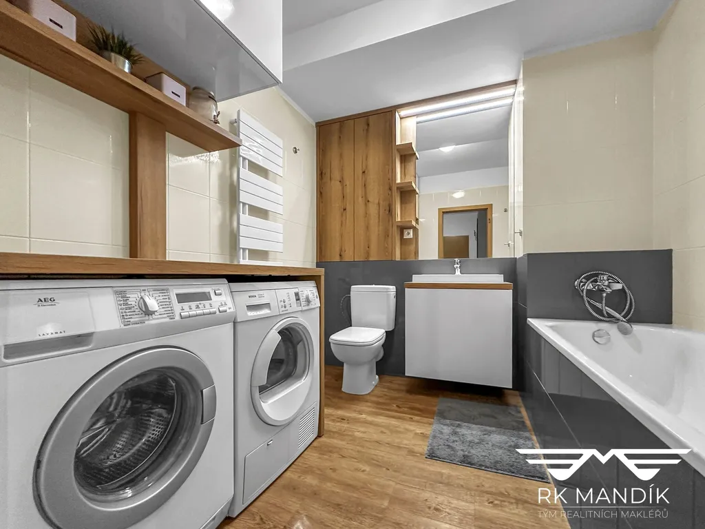 ​Vstupní chodba (10,55 m²) je vybavená kvalitními bezpečnostními dveřmi, vestavnou šatní skříní a praktickým věšákem se zrcadlem. Koupelna s WC (5,69 m²) je vybavena pračkou zn. Bosch, sušičkou AEG, úložnými prostory, topným tělesem, vanou a toaletou. Druhá samostatná toaleta (2,22 m²) je vybavena umyvadlem a úložným prostorem.