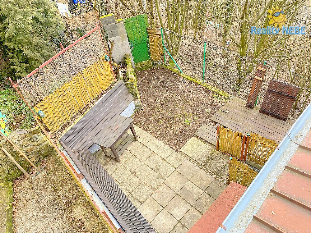 Přízemí – předsíň, obývací pokoj se zařízenou kuchyní s myčkou., lednicí, velká terasa a menší pokoj cca 4 m² (celkem cca 30 m²)