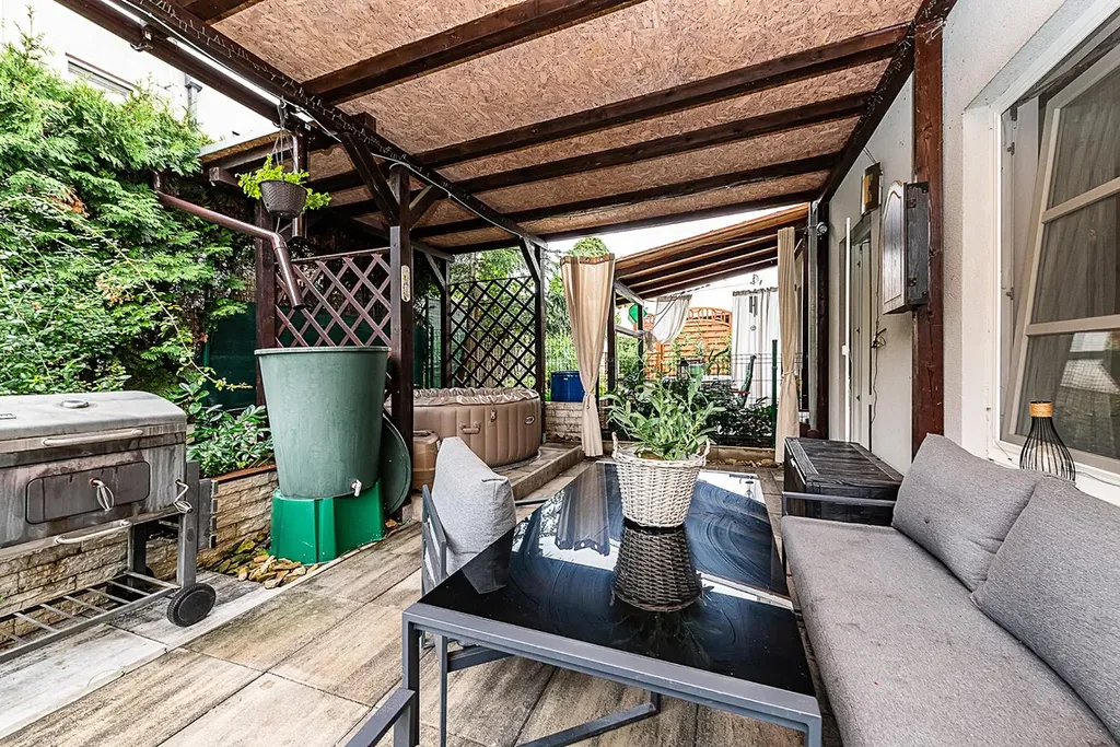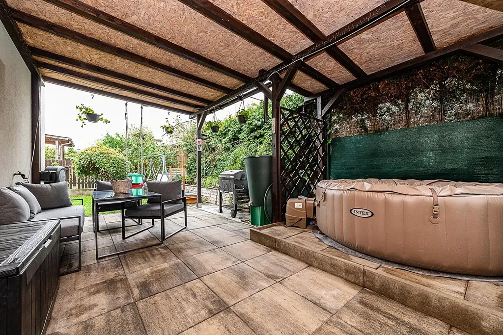 Zahrada s pergolou nabízí příjemné soukromí pro relaxaci i posezení s rodinou či přáteli, před domem jsou k dispozici dvě parkovací místa.