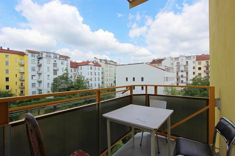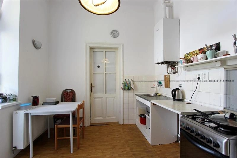 Byt disponuje společnou kuchyní, která je vybavena kuchyňskou linkou s plynovým sporákem a troubou, lednicí, mikrovlnnou troubou a jídelním stolem se židlemi. K dispozici je také sdílený balkon přístupný z kuchyně. V bytě bydlí další dva nájemníci.