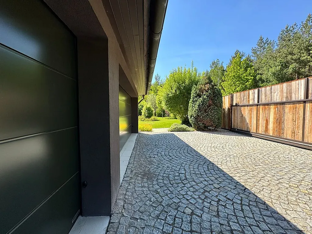 Nabízíme k prodeji samostatně stojící moderní vilu, po kompletní rekonstrukci v roce 2024, nacházející se v klidné části Unhoště u Prahy.Výjimečný pozemek 2 573 m², přímo navazující na lesy CHKO Křivoklátsko. Vila je o celkovéužitné ploše 375 m² má promyšlený půdorys, velkorysá okna a přímé vstupy do pečlivě upravené zahrady. Dispozice zahrnuje 5 ložnic, pracovnu, šatnu, 3 koupelny, kuchyni, obývací pokoj, posilovnu, dvougaráž a další praktické zázemí včetně druhé kuchyně a prádelny. Zastřešený, vyhřívaný bazén s tepelným čerpadlem umožňuje celoroční koupání; hlavní koupelna nabízí vířivku, velkorysý walk-in sprchový kout a luxusní obklady z přírodního kamene. Vytápění zajišťuje tepelné čerpadlo se zemními vrty, samozřejmostí je chytré osvětlení a stínění s blackout závěsy v ložnicích. Zahrada je vzrostlá, členitá, s automatickým profesionálním zavlažováním, řadou klidových zákoutí, altánem, vlastním sportovním hřištěm a zahradním domkem pro hosty či práci; příjezd vede přes elektrickou bránu s parkováním pro více vozů. V docházkové vzdálenosti je golf, restaurace a další volnočasová nabídka, v nedaleké Unhošti kompletní občanská vybavenost; do centra Prahy se pohodlně dostanete autem zhruba za 25 minut. Ideální kombinace nadčasového designu, soukromí a přírody doslova za dveřmi.