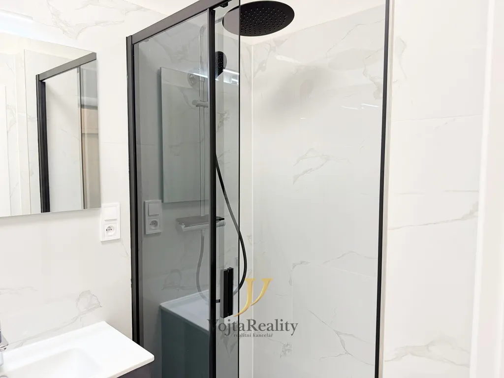 Velkoryse řešená koupelna nabízí podlahové vytápění, prostorný elegantní sprchový kout s a sladěné designové prvky. Standardem jsou kvalitní baterie a sanitární vybavení značek Grohe a Geberit, které zajišťují spolehlivost a dlouhou životnost. Vedle koupelny se nachází praktická technická místnost s bojlerem a přípravou pro pračku i sušičku.
