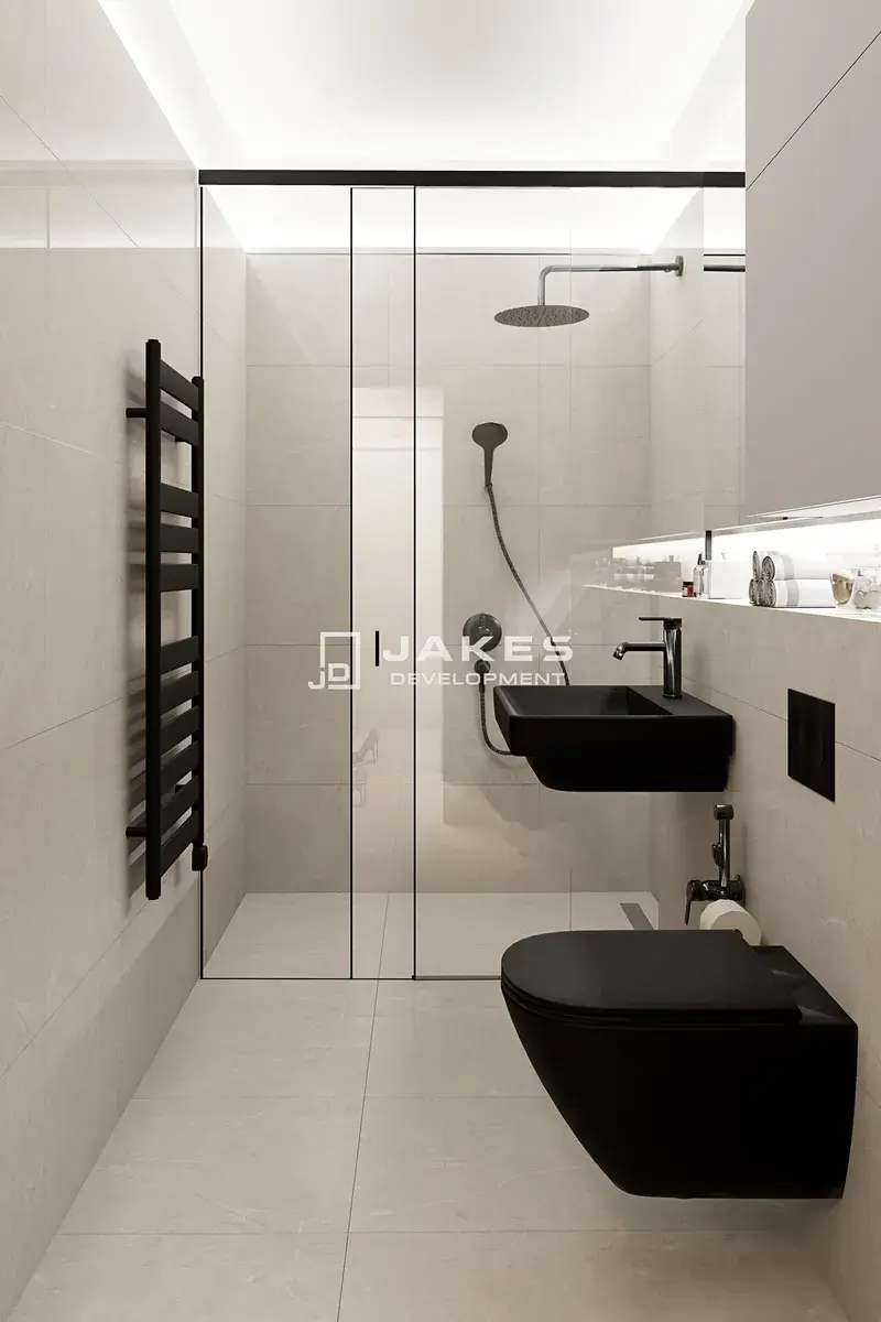 Byt bude dokončen ve vysokém standardu zahrnujícím kvalitní vinylové podlahy, moderní interiérové dveře a elegantní koupelnu s keramickými obklady a sanitou značky Laufen. Vše je navrženo s důrazem na nadčasový design, funkčnost a kvalitu použitých materiálů.
