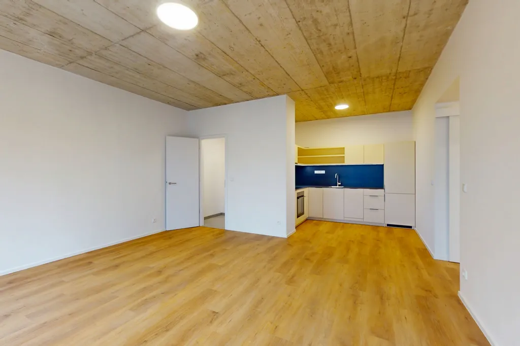 Rekonstrukce celého objektu dala vzniknout moderním bytům s nadčasovým designem a otevřeným, světlým prostorem. Pohledový betonový strop zde tvoří výrazný designový prvek, který interiéru propůjčuje autenticitu a stylový industriální nádech.
