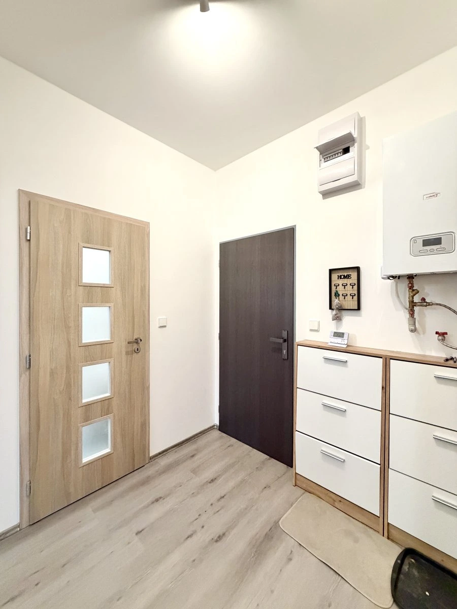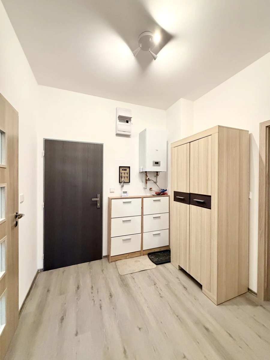 Byt se nabízí částečně vybavený. Kuchyně disponuje myčkou, elektrickou troubou, varnou deskou, mikrovlnnou troubou a digestoří. Obývací část je zařízena pohovkou, konferenčním stolem a komodami. Součástí ložnice je velká šatní skříň a pohovka. V druhém pokoji najdeme komodu a dvě šatní skříně. V koupelně je vana, umyvadlo, toaleta, pračka a skříňky.