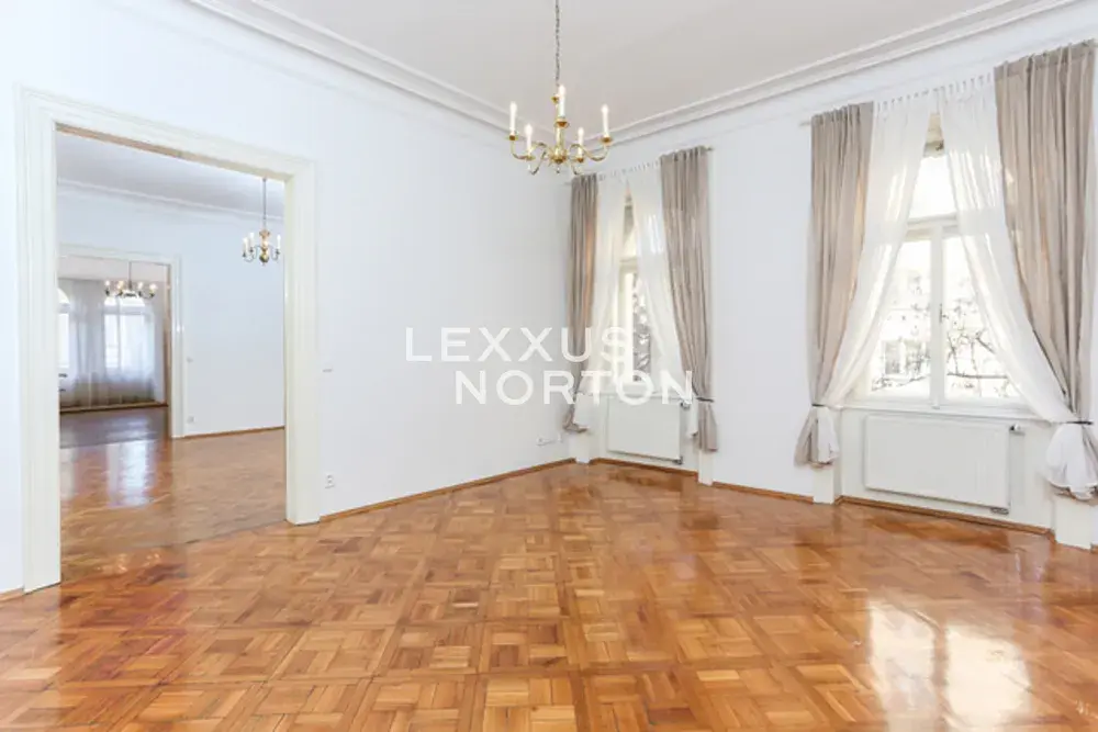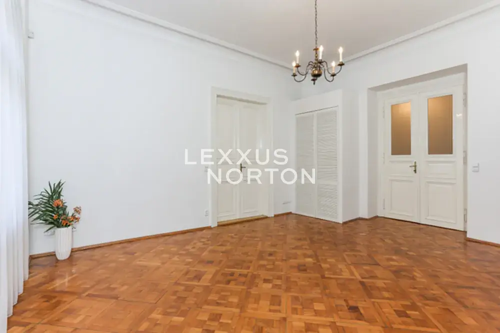 Samostatná kuchyň je vybavena sklokeramickou varnou deskou, troubou, lednicí, mrazákem a myčkou nádobí. Koupelny disponují vanou, sprchovým koutem, bidetem, v komoře se nachází kotel, pračka a sušička. Reprezentativní interiér nabízí velkorysá okna, vysoké stropy a dřevěné parkety.