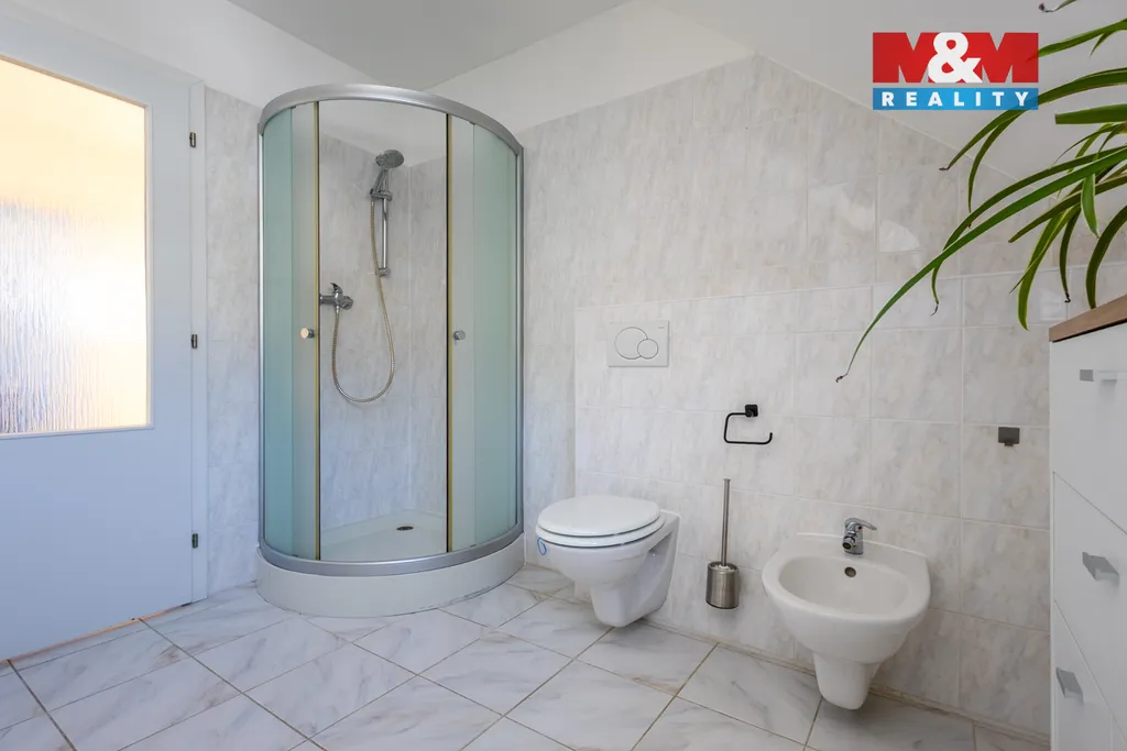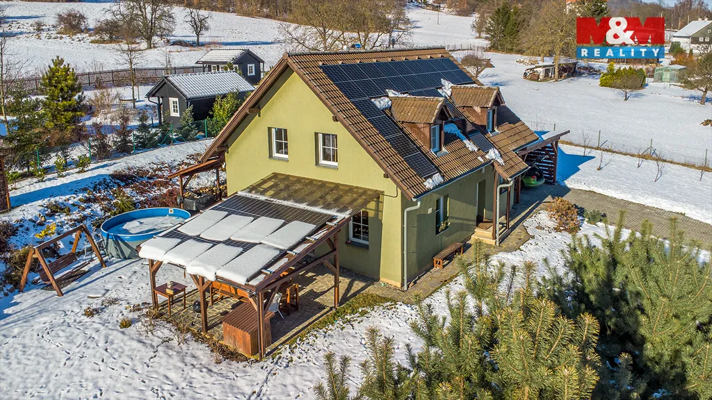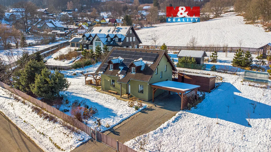 Prodej rodinného domu 5+kk v klidné části obce Slunečná, 9 km od České Lípy. Dispozice domu se rozkládá ve dvou nadzemních podlaží a nedílnou součástí je celkově oplocená okrasná zahrada, navržená architektem, s výměrou 1689 m². Dům je velmi prostorný. Obývací pokoj s kuchyní, hala, chodba, koupelna (sprch. kout + vana), samostatné WC, prádelna, technická místnost, tvoří první nadzemní podlaží. V druhém nadzemním podlaží jsou 3 pokoje, koupelna se sprchovým koutem a bidetem, pracovna a vstup na pochozí půdu. Vytápění a ohřev vody tepelným čerpadlem (podlahové topení + radiátory), další zdroj doplňují solární panely s baterií o výkonu 10 kWh. To vše tvoří nízké provozní náklady. Zahrada se může pochlubit vjezdem s elektrobránou na dálkové ovládání, krytým stáním na dvě auta s elektronabíjecí stanicí, finskou saunou, zahradním domkem, krytou terasou se vstupem přímo z domu, pergolou, bazénem a skleníkem. Dům je vybaven venkovními roletami a krásným výhledem do krajiny. Více info v RK.