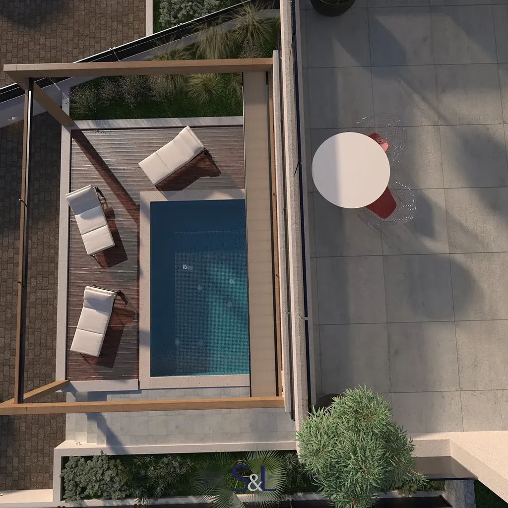 Jeden z největších benefitů vily je venkovní bazén 5 x 3 metry, který je vybaven moderní technologií pro udržitelnost a pohodlí. Ohřev vody zajišťuje teplené čerpadlo, čistění probíhá pomocí elektrolytické filtrace slanou vodou, která minimalizuje použití chemie a je šetrnější k pokožce.