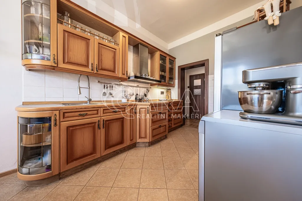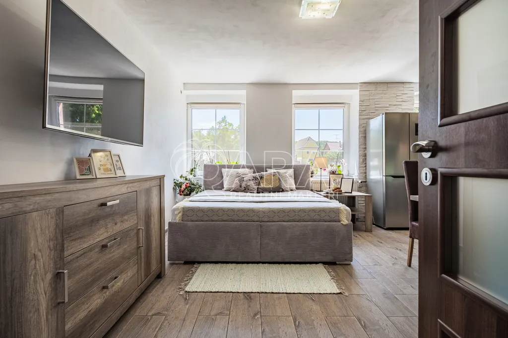 Do domu se vchází bývalým průjezdem, ze kterého je nyní uděláno prostorné garážové stání, takže pěkně suchou nožkou z domu do auta. Vjezd je opatřen novými elektrickými garážovými vraty se samostatným vstupem "pro pěší". Je zde umístěný Wallbox - nabíjecí stanice pro dvě elektroauta. Z průjezdu se vchází do přízemí domu nebo rovnou na zahradu. V přízemí je situován samostatný byt 1+kk, který je možno využít jako kancelář či máte-li odrostlejšího potomka a chce se cítit tak trochu samostatně, i zde je tato možnost, nebo pronájem. Byt je vybaven plně funkční kuchyňskou linkou, velkou a pohodlnou manželskou postelí s nočními stolky, komodou a TV, jídelním stolem a velkorysou šatní skříní na míru, prostornou koupelnou se sprchovým koutem a toaletou.