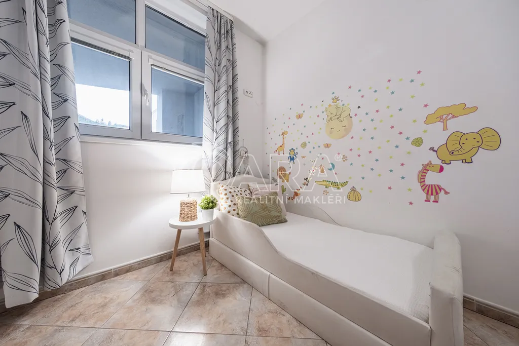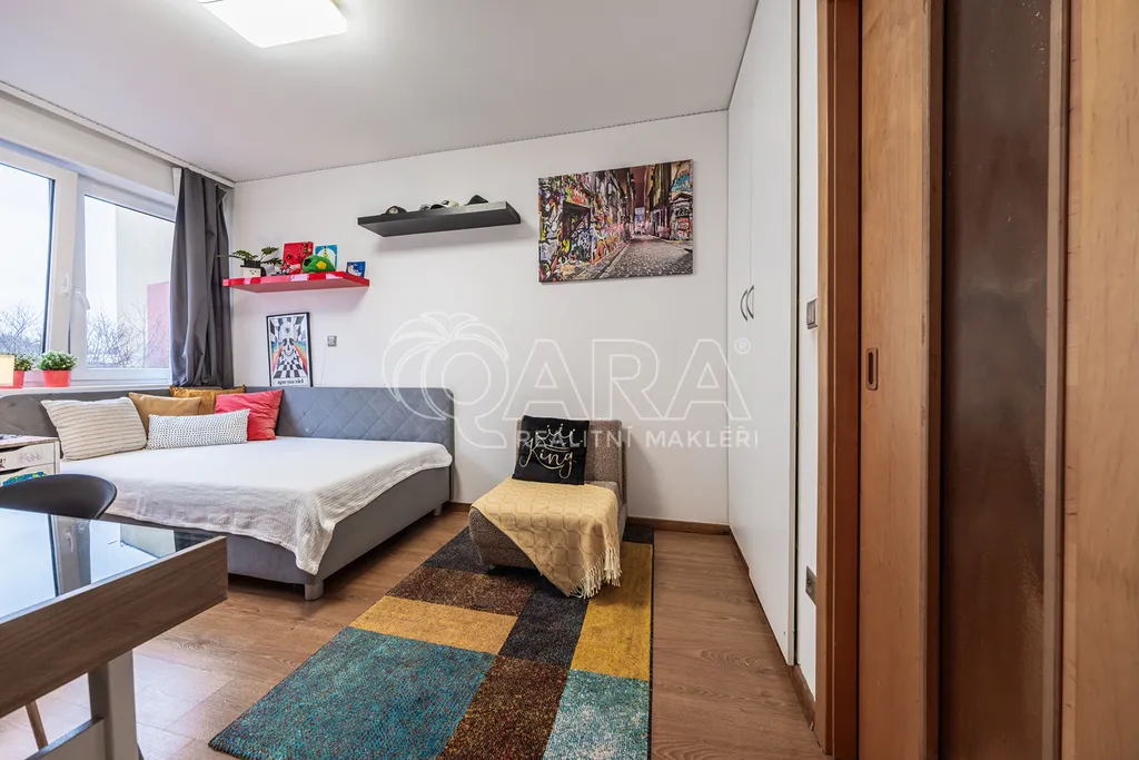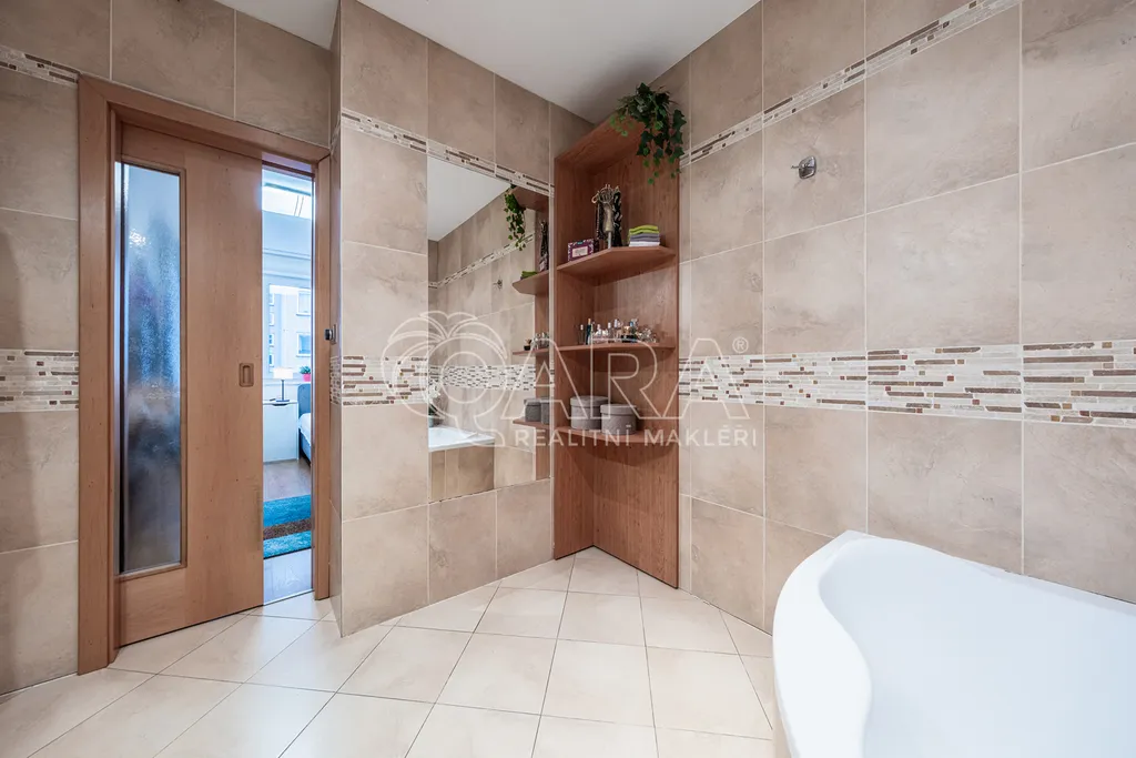 Dominantou příjemného bydlení je prostorný obývací pokoj propojený s kuchyňským koutem. Obývací pokoj dále navazuje na samostatný "studentský" pokoj s vlastní koupelnou s rohovou vanou a toaletou. Komfort výjimečného bytu doplňuje podlahové vytápění, které je v celém bytě včetně garáže. Každou hospodyňku pak stoprocentně potěší technická místnost spojená s prádelnou, sušárnou a umně skrytými úložnými prostory.