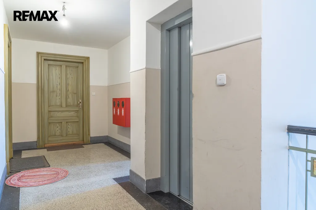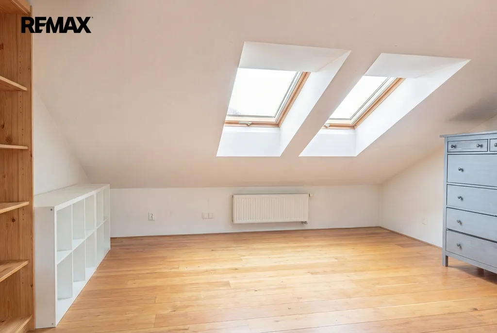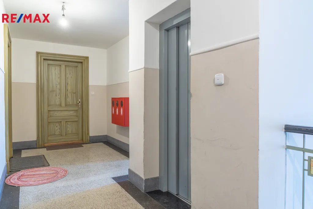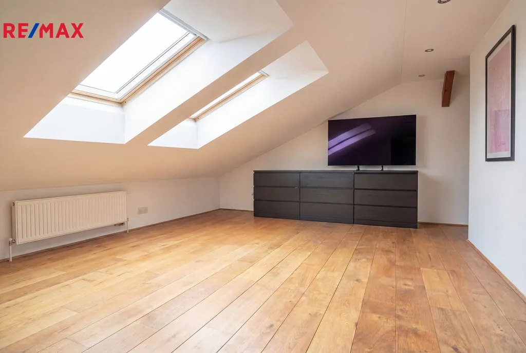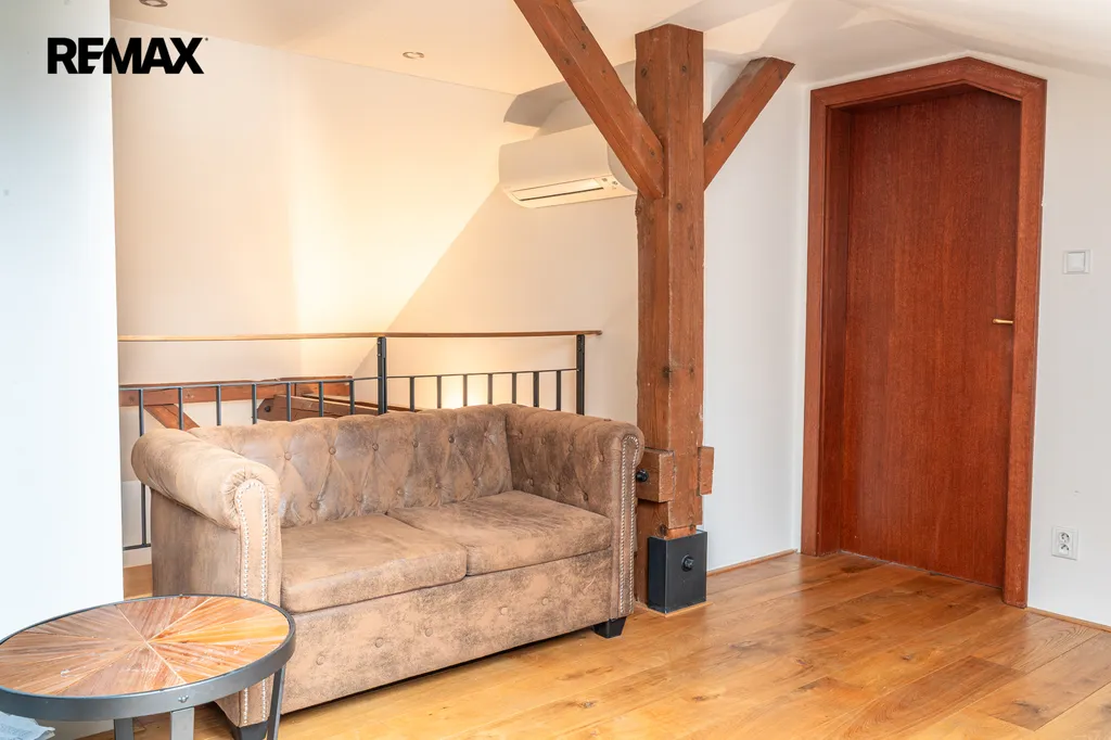Po schodišti se dostanete do horního patra, kde se nachází pracovna (či ložnice) a další samostatná ložnice. Z této úrovně bytu se otevírají nádherné výhledy na Pražský hrad, Mánes i řeku Vltava. Byt je vybaven třemi klimatizačními jednotkami, dřevěnými podlahami a praktickými úložnými prostory. Dům si zachovává historický ráz a je vybaven výtahem.