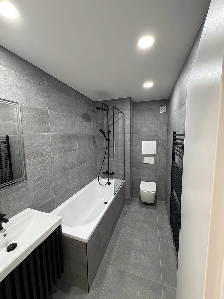 Byty jsou nově zrekonstruované v moderním, čistém stylu s důrazem na kvalitu a funkčnost. Samozřejmostí jsou nové podlahy, interiérové dveře, designové koupelny a nové kuchyňské linky (myčka, trouba, indukce, digestoř). Použité materiály jsou odolné a navržené pro dlouhodobé bezproblémové užívání.